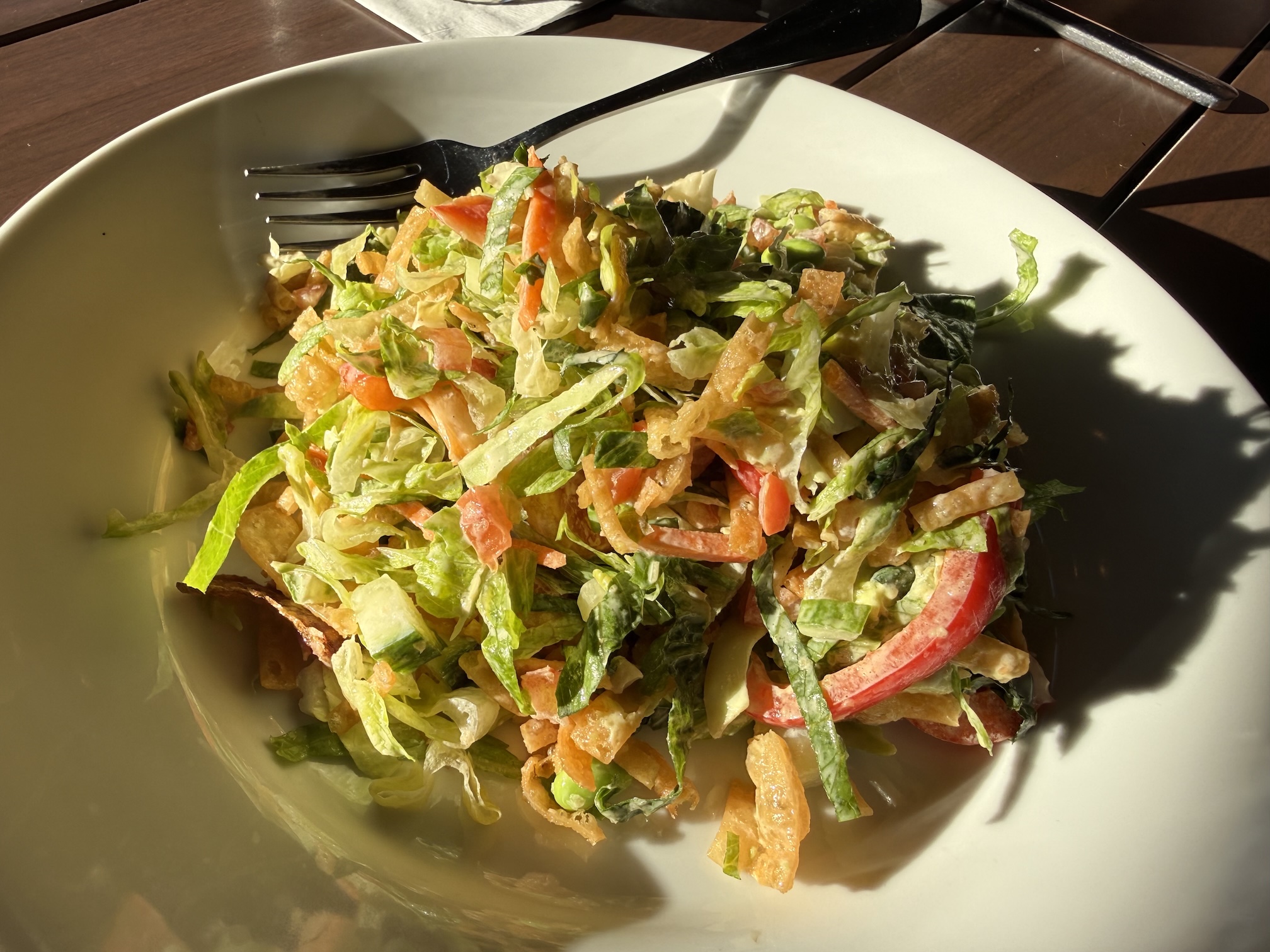 The menu tends to be an upscale version of a sports bar menu with a large selection of appetizers and burgers, but also a surprising variety of salads and other dishes. I had the miso Asian salad, which was fantastic, very refreshing and light. Yet a large enough serving to be satisfying.