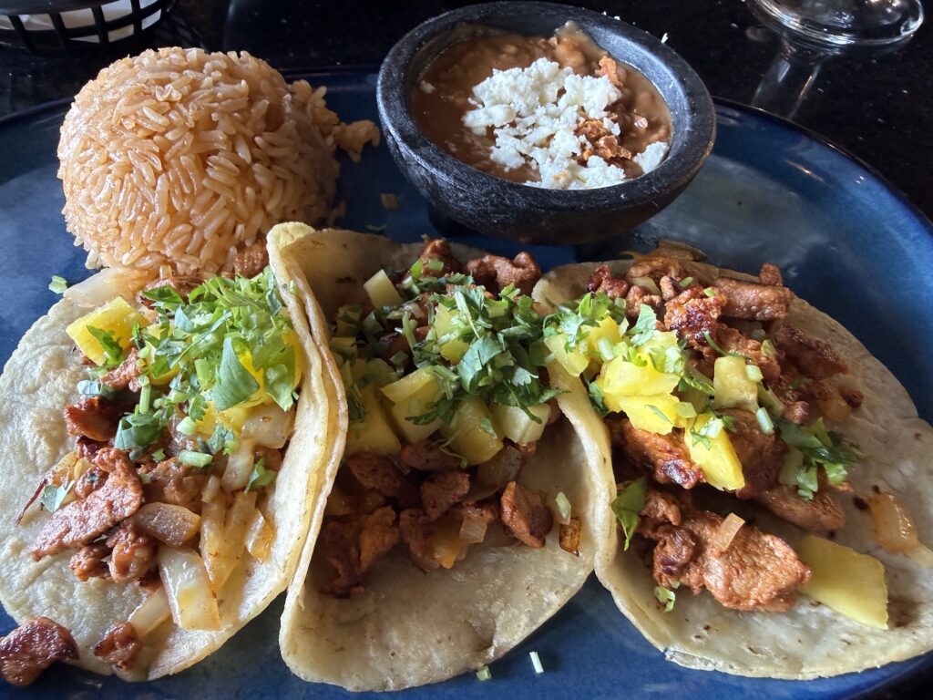 The menu is fairly extensive, and offers some authentic preparations such as Pastor, Mole, and even a Molcajete. We tried the queso, the chicken quesadilla, and the pastor tacos. Everything was fine, but seemed rather under seasoned and certainly underspiced. The meal includes complimentary tortilla chips and a very mild salsa.