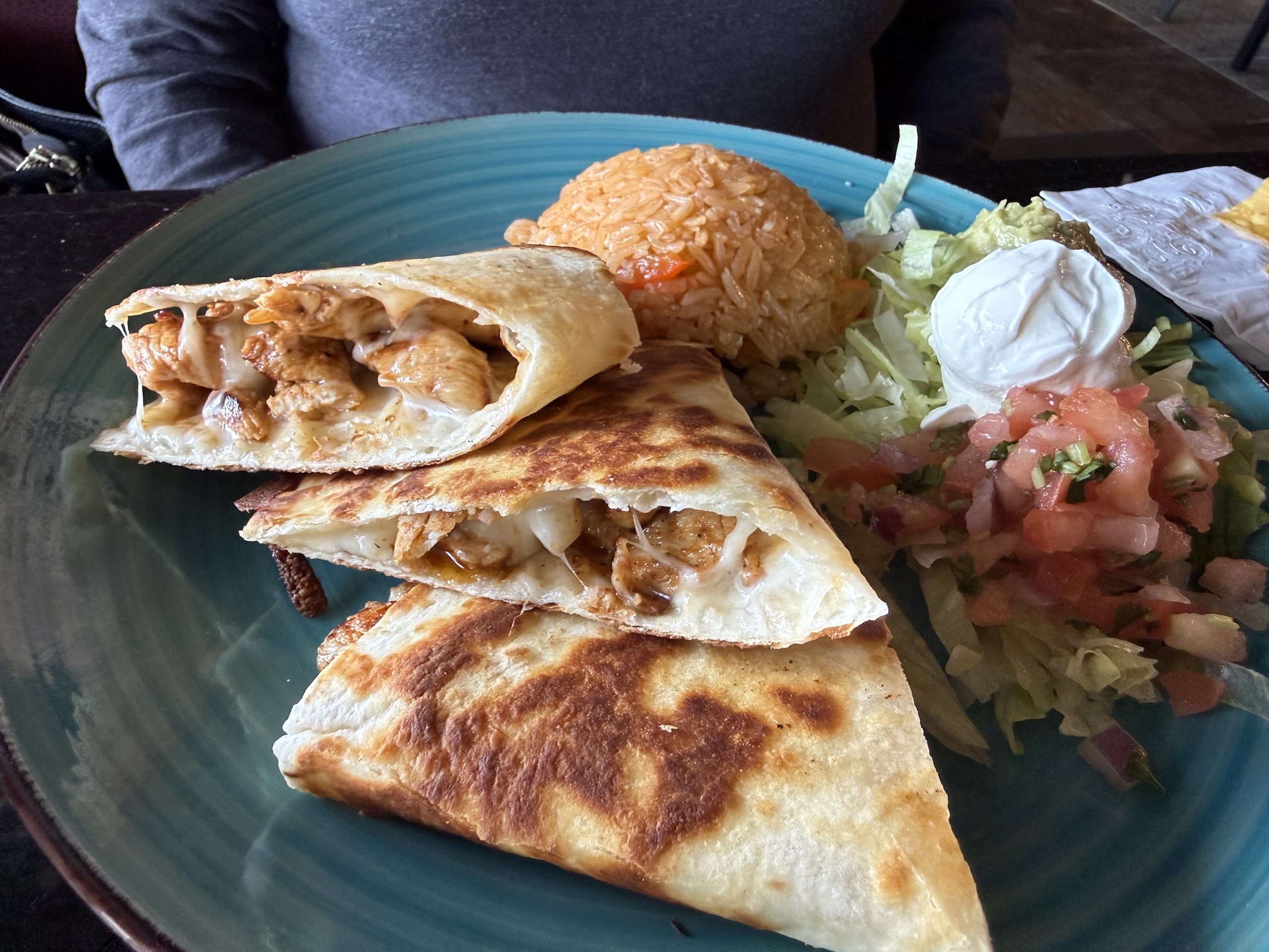 The menu is fairly extensive, and offers some authentic preparations such as Pastor, Mole, and even a Molcajete. We tried the queso, the chicken quesadilla, and the pastor tacos. Everything was fine, but seemed rather under seasoned and certainly underspiced. The meal includes complimentary tortilla chips and a very mild salsa.